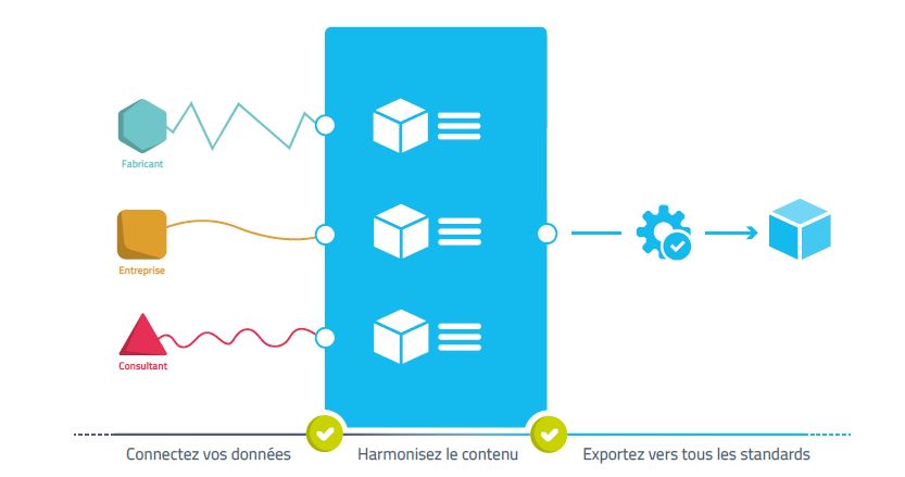 Des intégrations IT doivent souvent être mises en place au sein de l’entreprise ou des parties prenantes du projet : les données techniques peuvent venir directement du PIM d’un fournisseur, les délais de livraison venant par exemple directement du logiciel des achats et les données d’entretien peuvent être poussées dans le logiciel de gestion d’actifs, tel que Maximo… Cela permet d’optimiser toute la chaîne d’approvisionnement et de maintenance.