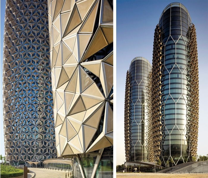 Revêtu d’un système d’ombrage dynamique destiné à réduire le gain solaire du bâtiment de 50%, les Al Bahr Towers testent les limites du design dynamique. La façade est dotée d’un système inspiré du traditionnel moucharabieh sauf que celui-ci est informatisé afin de s’adapter aux conditions météorologiques changeantes. Le moucharabieh est un dispositif de ventilation naturelle forcée fréquemment utilisé dans l’architecture traditionnelle des pays arabes. La réduction de la surface produite par le maillage du moucharabieh accélère le passage du vent. Celui-ci est mis en contact avec des surfaces humides, bassins ou plats remplis d’eau qui diffusent leur fraîcheur à l’intérieur du bâtiment.