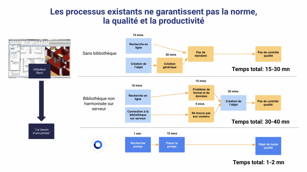 La gestion des objets BIM représente un défi quotidien majeur, surtout pour les architectes et les bureaux d’études. La dispersion des objets BIM sur différents supports crée un environnement chaotique. Rendant leur localisation et utilisation non seulement fastidieuse mais aussi inefficace. Cette situation entraîne une perte de temps considérable. Les professionnels passent en moyenne 7h30 par semaine à rechercher des objets sans les trouver, selon l’Association Information et Management (AIM).